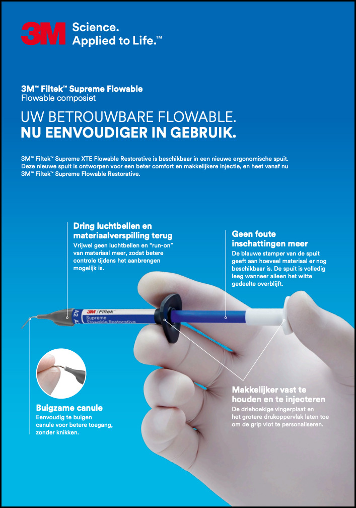 Het 3M™ Filtek™ Supreme Flowable Restauratiemateriaal is ontworpen voor een breed scala aan indicaties en technieken. Het biedt een uitstekende glansretentie en slijtageweerstand. Met dit veelzijdige composiet kunt u tandheelkundige restauraties maken die aan de hoogste verwachtingen voldoen, verkrijgbaar in een reeks van 12 kleuren die overeenstemmen met de bodykleuren van 3M™ Filtek™ Universal Restauratiemateriaal en 3M™ Filtek™ Supreme XTE Universeel Restauratiemateriaal (A1, A2, A3, A3.5, A4, B1, B2, C2, D2).