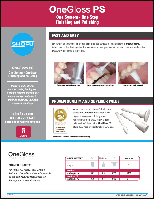 OneGloss en OneGloss PS zijn beide éénstaps polijstsystemen van Shofu, ontworpen voor het afwerken en polijsten van composietrestauraties. Het belangrijkste verschil tussen de twee ligt in hun ontwerp en gebruik:
